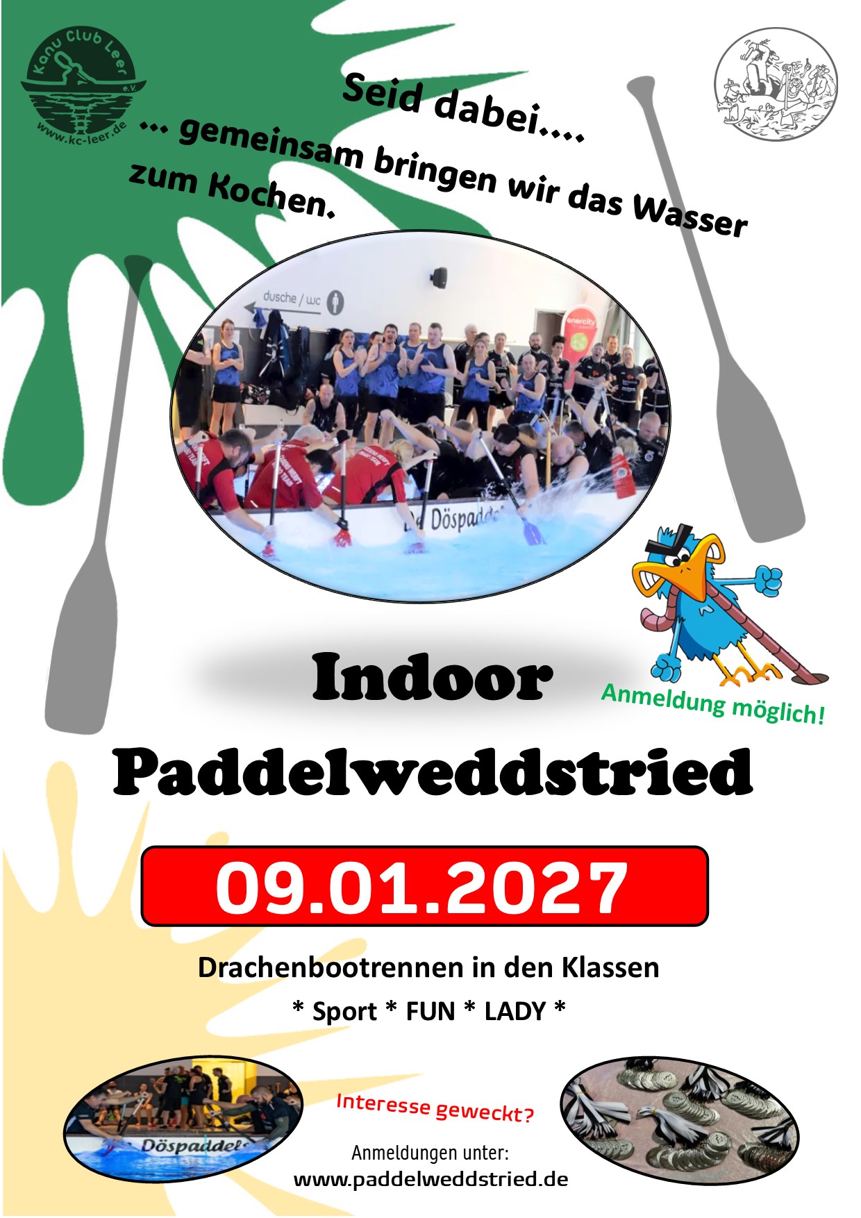 Am 09.01.2027 von 08:00h bis 18:00h findet der nächste "Indoor Paddelweddstried 2027" statt. Auch diesmal erwartet euch ein spanendes Rahmenprogramm, gute Bewirtung und jede Menge Drachenboot!
